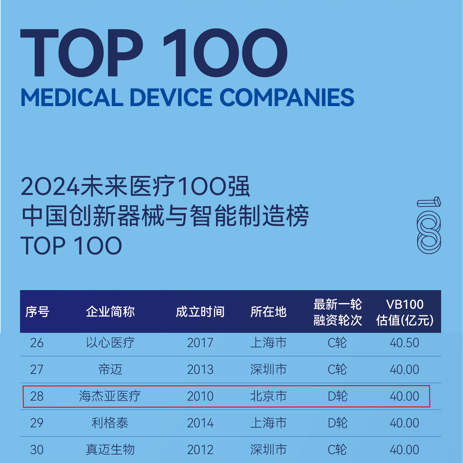 2024年5月9日,第八屆未來醫(yī)療100強榜單發(fā)布,海杰亞醫(yī)療再次入選2024未來醫(yī)療100強主榜中國創(chuàng)新器械與智能制造榜TOP100,同時,康博刀?「易」系列復合式冷熱消融系統(tǒng)入選VBEF醫(yī)療健康產(chǎn)業(yè)創(chuàng)新力產(chǎn)品榜。